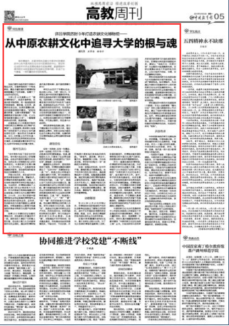 5月20日,《中国教育报》高教周刊头条刊发《许昌学院历时9年打造农耕文化博物馆——从中原农耕文化中追寻大学的根与魂》一文,全文逾3000字,图文并茂地介绍了我校农博馆建设的艰辛历程与目标定位,以及农博馆在传承弘扬中华传统文化、宣教育人、学术研究等方面的成效和积极意义,向社会各界展示了一个有情怀、有特色的高校博物馆,一个自觉肩负社会责任与文化使命的博物馆,一个开放与包容的博物馆。文章指出,“如今,它的意义已不仅仅是一个学校历史的记忆符号和校友的往日情思,还承载着珍藏农耕时代记忆、弘扬中华传统文化的重大使命。”