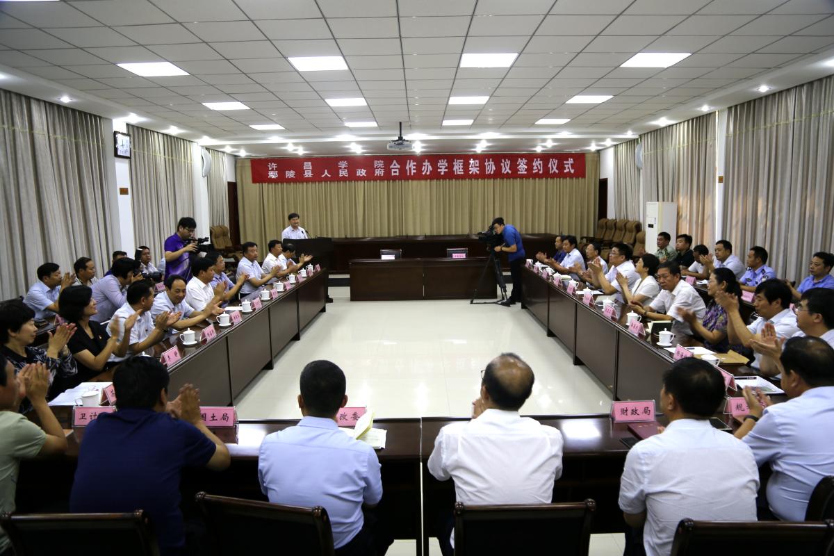 9月7日上午,我校与鄢陵县人民政府合作办学框架协议签约仪式在鄢陵县政府会议室举行。校党委书记闫纪建、院长赵继红、副院长赵正风、副院长崔斌,鄢陵县委书记尹二军、县长李东岭及四大班子领导等出席签约仪式。我校党政办、教务处、财务处、发展规划处、校地合作办公室、基建处等职能部门负责人,陈化店镇党政正职和县教育、财政、发改、规划、国土等部门负责人参加签约仪式。仪式由鄢陵县委常委、常务副县长韩宏涛主持。