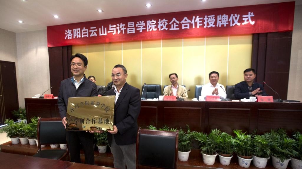 19日上午,在洛阳白云山景区举行的签约仪式上,洛阳白云山文化旅游发展公司副总经理寇晓华和我校校地合作办公室副主任马金柱分别代表合作各方签署了《旅游专业产学研战略合作协议》。马金柱副主任受学校领导委托,代表学校为洛阳白云山文化旅游发展公司授予许昌学院产学研合作基地牌匾。
