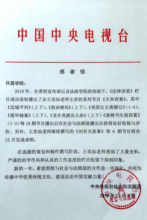 据了解,我校曾在2017年就收到过来自中央电视台的感谢信。2016年11月至今,王忠灿老师在中央电视台“社会与法”频道播出主讲的《大宋奇案》系列节目已经播出40余集,为节目赢得了较高的收视率和观众满意度。