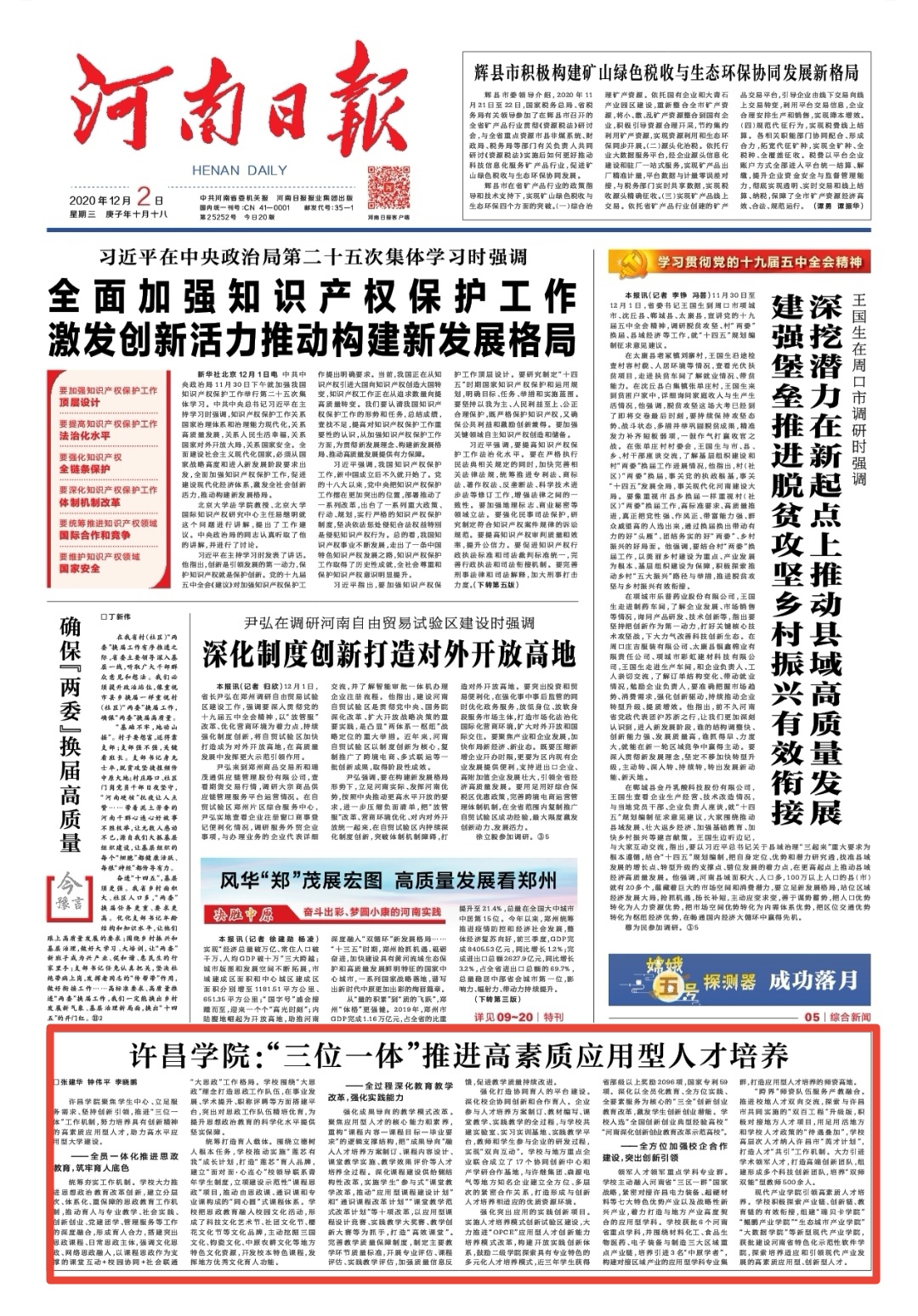 12月2日,《河南日报》头版以《许昌学院:“三位一体”推进高素质应用型人才培养》为题,从“全员一体化推进思政教育,筑牢育人底色”“全过程深化教育教学改革,强化实践能力”“全方位加强校企合作建设,突出创新引领”三个方面,详细报道了我校聚焦学生中心、立足服务需求、坚持创新引领,推进“三位一体”工作机制,努力培养具有创新精神的高素质应用型人才,助力高水平应用型大学建设的具体举措和典型经验。