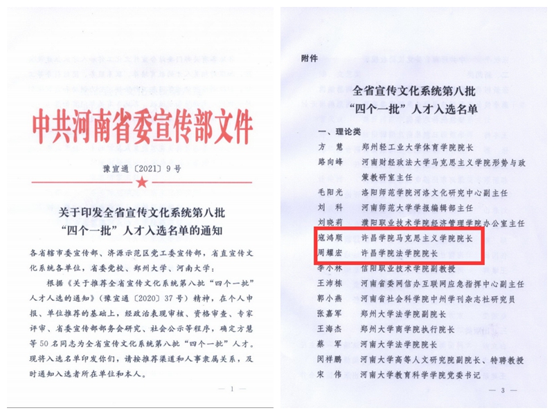 近日,中共河南省委宣传部公布了全省宣传思想文化系统第八批“四个一批”人才的评选结果,由我校推荐的马克思主义学院寇鸿顺教授、法学院周耀宏教授入选理论类人才。
