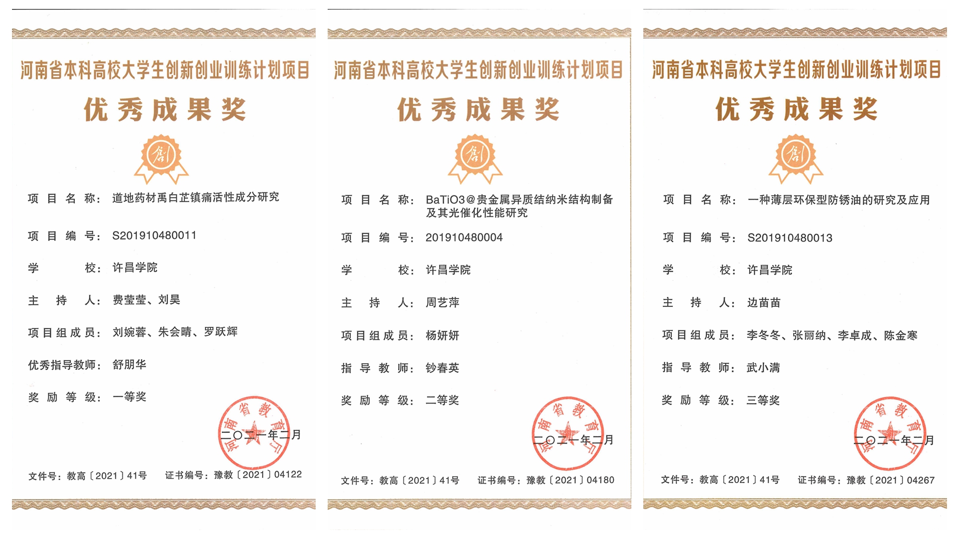 日前,河南省教育厅公布了2020年河南省本科高校大学生创新创业训练计划项目优秀成果奖评审结果,我校3个本科生团队分获优秀成果一二三等奖。