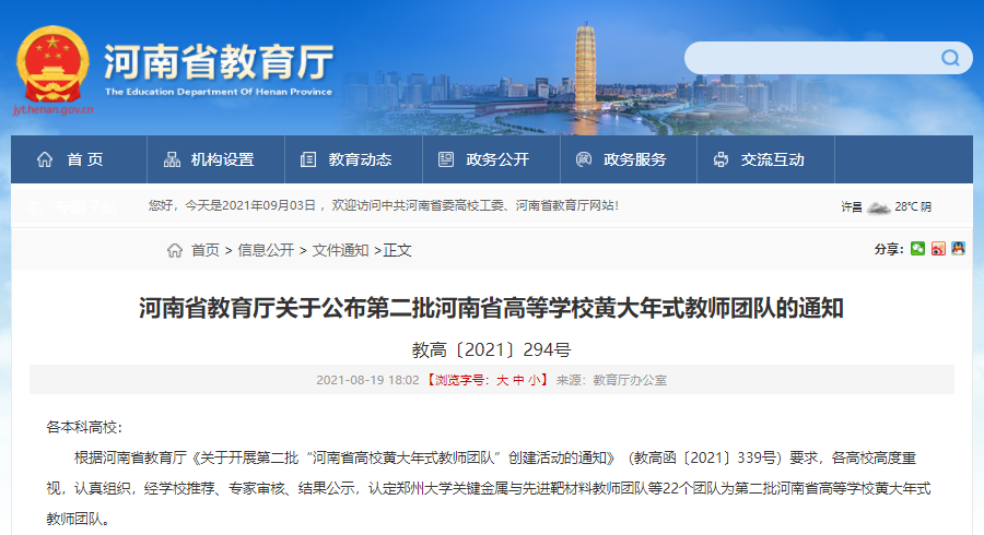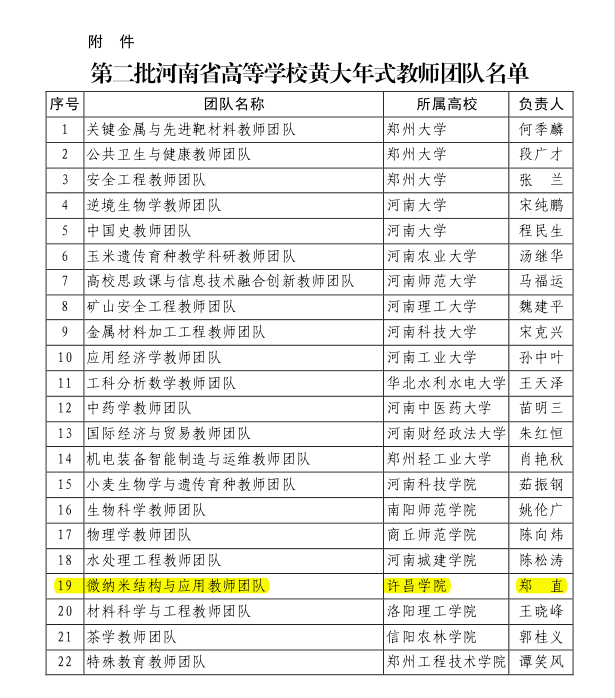 近日,河南省教育厅发布了《关于公布第二批河南省高等学校黄大年式教师团队的通知》(教高〔2021〕294号),我校郑直教授为负责人的微纳米结构与应用教师团队入选第二批“河南省高校黄大年式教师团队”。