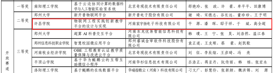 我校信息工程学院(鲲鹏产业学院)师生首次参赛,与黄河科技集团信息产业发展有限公司、河南煜祺网络技术有限公司、河南宸宇扬电子科技有限公司组建三支校企联合团队,团队提交的《基于鲲鹏的指静脉采集平台》《智慧配料系统》和《物联网工程实践创新教学平台的设计与实现》作品,经过行业初审、专家评审和线上答辩,在近百个团队中脱颖而出,分获“金融应用赛道”“大企业应用赛道”和“开放赛道”二等奖。(图片由信息工程学院提供)