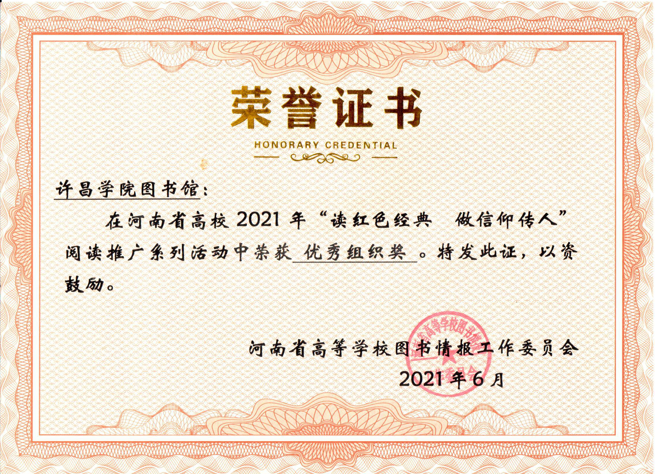 近日,河南省高等学校图书情报工作委员会发布了《关于公布河南省高校图书馆2021年“读红色经典 做信仰传人”阅读推广系列活动获奖名单的通知》(豫高校图工委[2021]18号)。我校图书馆荣获“优秀组织奖”,我校15名师生在系列活动中获奖。