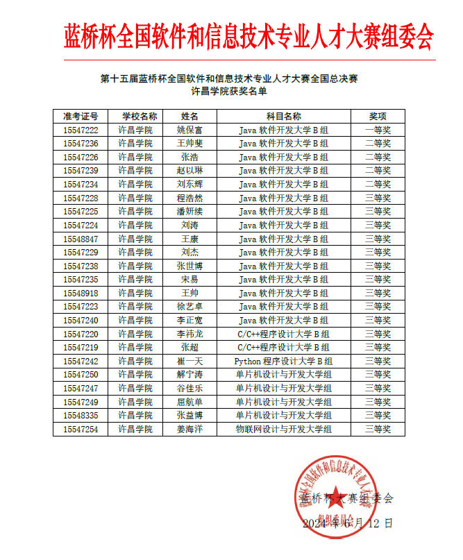 近日,第十五届“蓝桥杯”全国软件和信息技术专业人才大赛全国总决赛成绩揭晓,我校信息工程学院学生凭借扎实的专业基础和出色的实践能力,在比赛中获一等奖1项,二等奖4项,三等奖18项,获奖总量再创历史新高。