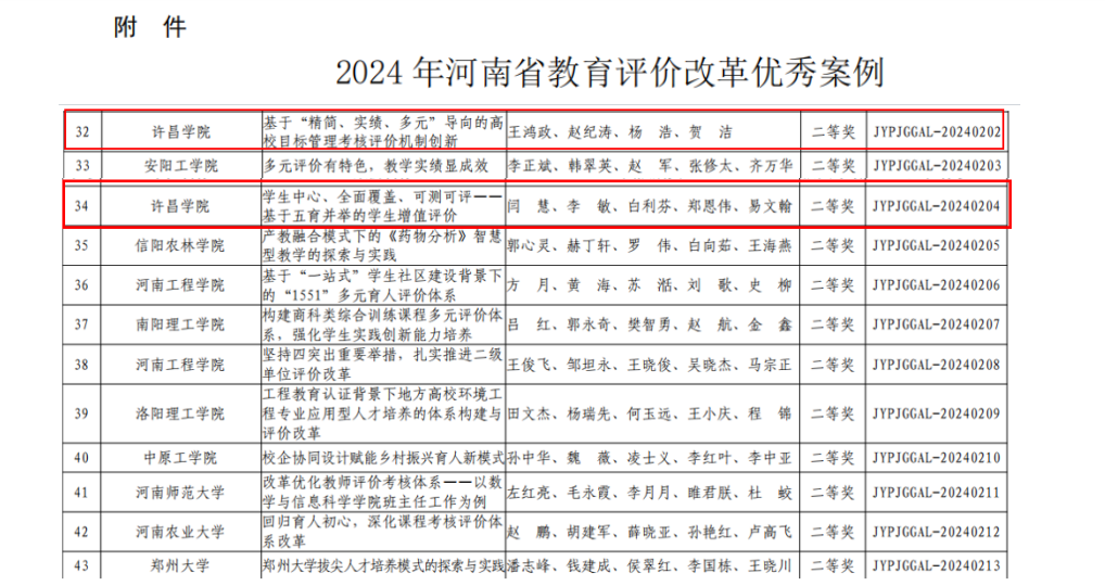 近日,河南省教育厅办公室公布了2024年河南省教育评价改革优秀案例评选结果。我校申报的《基于“精简、实绩、多元”导向的高校目标管理考核评价机制创新》《学生中心、全面覆盖、可测可评——基于五育并举的学生增值评价》2项成果均荣获二等奖。