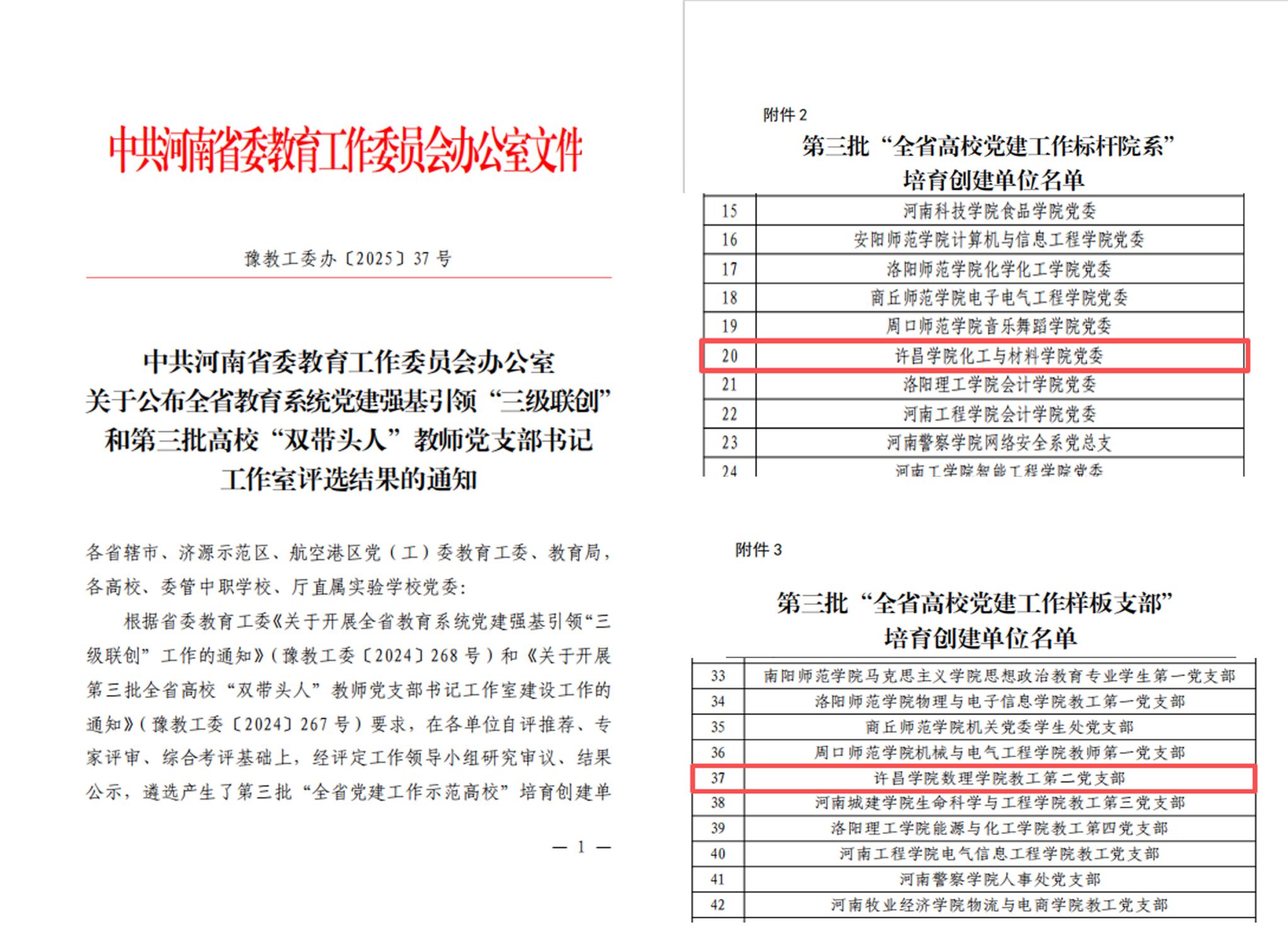 近日,河南省委教育工委公布了全省教育系统党建强基引领“三级联创”培育创建单位名单。我校化工与材料学院党委入选“全省高校党建工作标杆院系”培育创建单位,数理学院教工第二党支部入选“全省高校党建工作样板支部”培育创建单位。