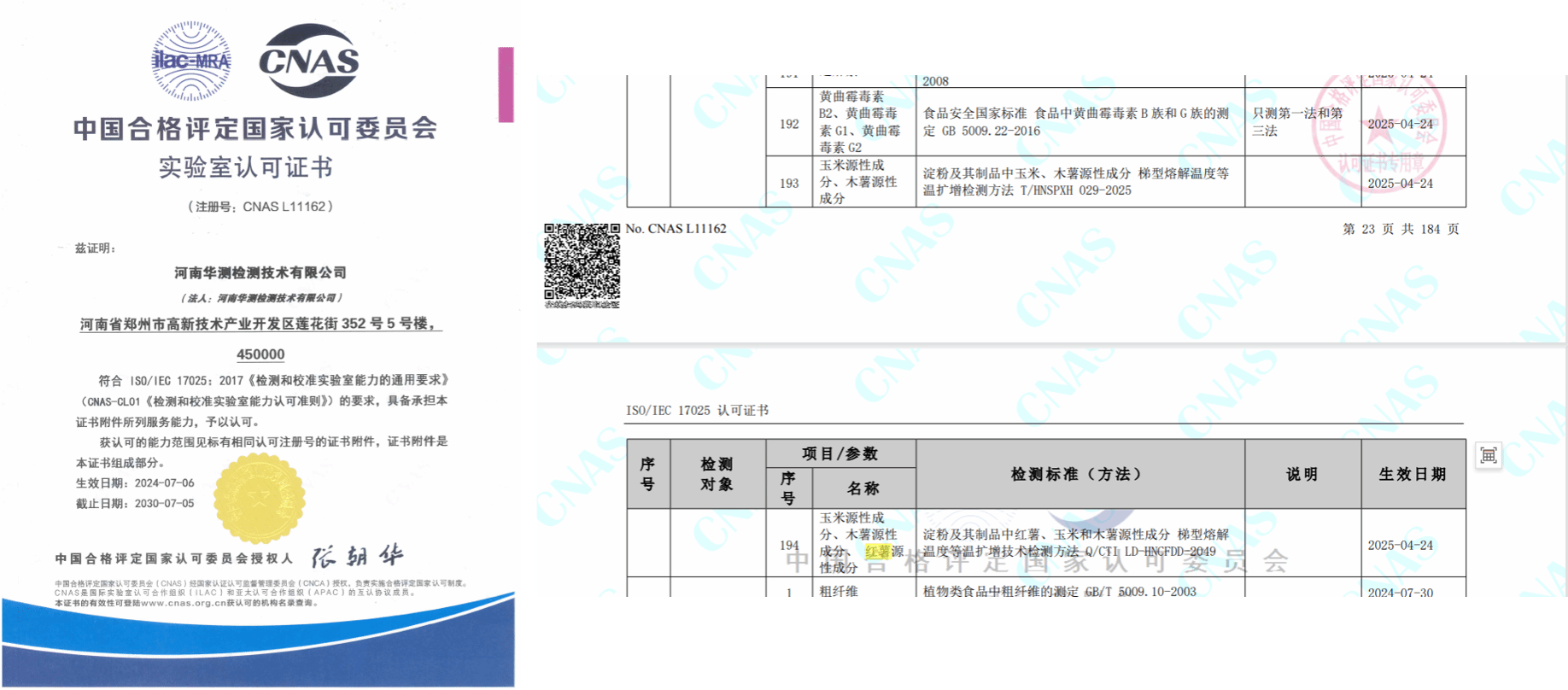 近日,我校与企业联合制定的《淀粉及其制品中玉米、木薯源性成分梯型熔解温度等温扩增检测方法》(T/HNSPXH 029-2025)通过CNAS权威认证,纳入第三方检测机构CNAS实验室认可证书类目,目前已实际应用于淀粉及其制品广大中小企业及大型商超的相关检验检测。