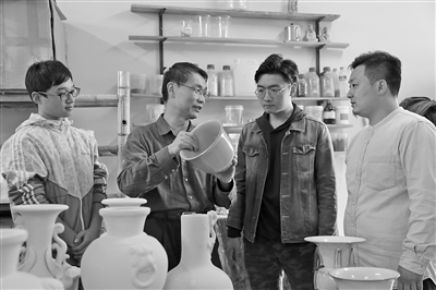 师生探讨纳米结构对钧瓷“釉色”和“釉质”的影响。本文作者 供图