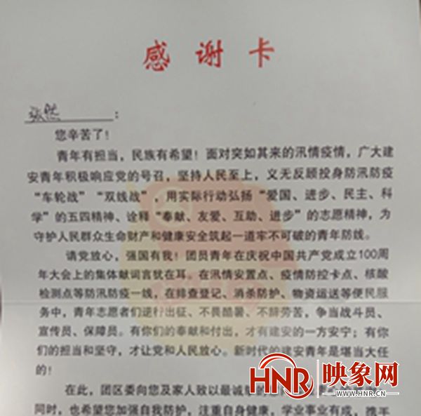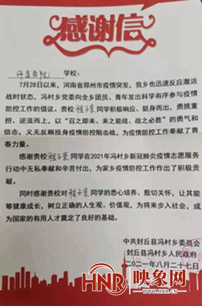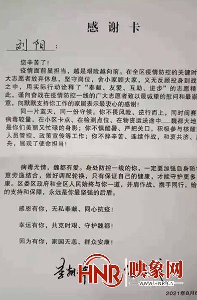 法学院2021级法学专业一班学生刘阳,响应社区号召,主动报名志愿者,积极参与所在社区防疫管控登记、政策宣传学习等工作。当收到许昌市魏都区人民政府送来的感谢信时,她说:“疫情面前显担当,越是艰险,青年人越是更应该向前。”