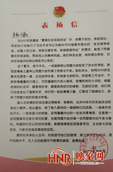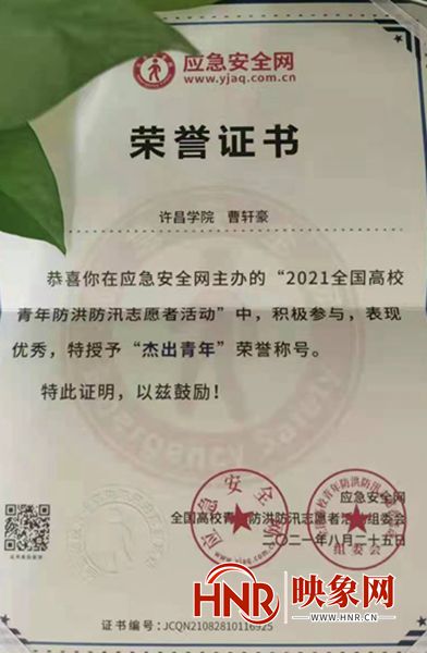 8月25日,应急安全网、全国高校青年防洪防汛志愿者活动组委会寄来荣誉证书,曹轩豪被授予“杰出青年”称号。他说:“志愿工作虽然辛苦,但是我觉得意义非凡,这将是我宝贵的人生财富。”