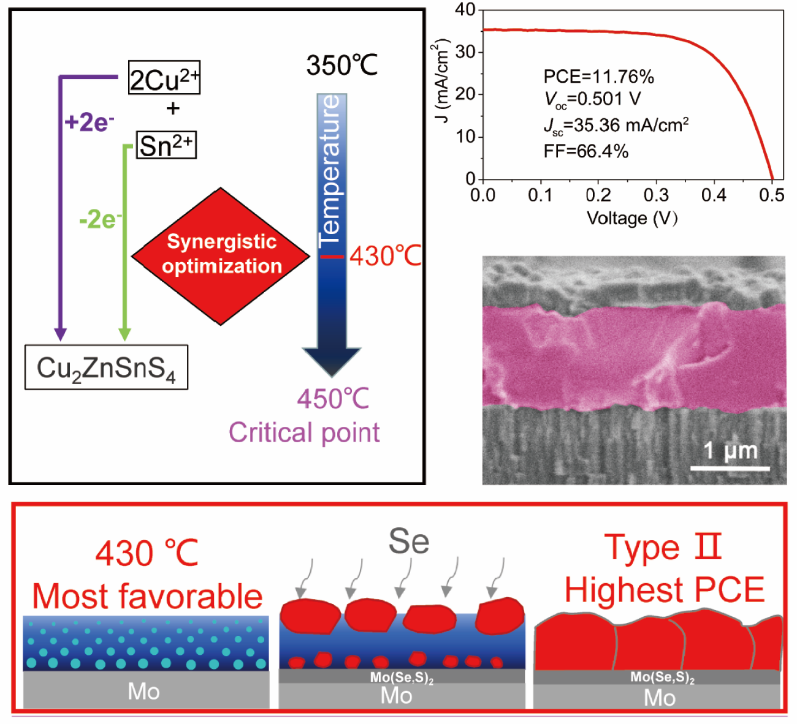 针对上述问题,郑直课题组与河南大学武四新教授合作,通过大量实验提出了一种可控制备大晶粒贯穿结构 CZTSSe的策略,也就是对Cu2+、Sn2+的氧化还原反应和预退火温度进行协同优化,通过一系列结构、形貌、电学和光电性能分析,确定了 430°C 是获得大晶粒贯穿结构最适宜的温度。论文提出了三种类型的薄膜生长模式以及临界预退火温度的概念,成功解释了大晶粒贯穿结构的生长机理和氧化还原速率的提升效应。拥有大晶粒贯穿结构 CZTSSe可以大大降低载流子在界面处的复合,从而有效提升电池效率。目前,在DMF基CZTSSe太阳能电池中,本工作取得了最高的光电转换效率11.76%和最高的开路电压501 mV。
