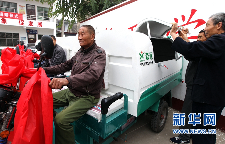 许昌县艾庄乡袁庄村一位村民试驾电动环卫保洁车