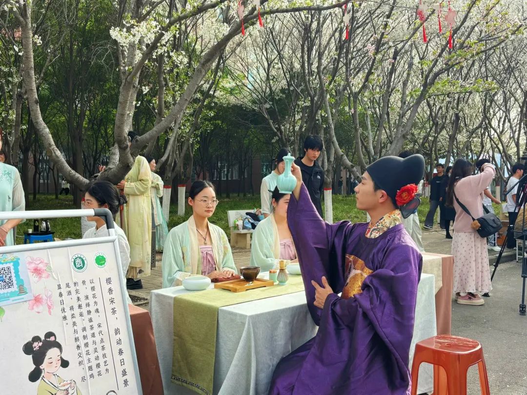 现场可以看到,“樱歌漫舞”歌舞快闪,依托音乐与舞蹈特色,将优秀传统文化、戏曲元素融入不同舞种、合唱等艺术表演形式之中,以快闪的方式呈现,感受传统文化与创新艺术的美妙交融;“樱韵声华”唱响青春,用歌曲串烧、歌曲联唱的方式,展现青年学子活力与激情,用歌声唱响青春,共赴春日的音乐盛宴;“武舞樱风”非遗舞动,通过舞龙舞狮、高跷旱船等社火表演与古典舞融合展演,体验非遗技艺的刚柔之美,见证千年民俗与青春活力的创意传承;“樱华古韵”国风雅集,樱花纷飞时节,汉服走秀与古风歌舞交织,曲艺悠扬于花间,书法墨香伴樱韵,投壶雅趣映古礼。师生共赏华夏文化之美,感受传统与现代的融合;“樱香春韵”技艺展示,以樱花为魂,宋代点茶技艺为骨,演绎静谧茶道与灵动樱花的完美邂逅。调制樱花主题鸡尾酒,将柔美与醇香交织,尽显春日优雅;“樱间拾趣”创意手作,通过制作精美书签或亲自串制樱花手链,感受樱花与知识的浪漫结合,体验手工创作的乐趣,传递樱花文化的浪漫与诗意;“樱趣创玩”科技魅力,运用3D打印技术,现场打印精美樱花模型,体验科技与艺术的融合,让樱花在指尖绽放,共同创造一场别样的春日回忆;“指尖樱艺”匠心独韵,融合专业知识与艺术巧思,制作樱花树脂、樱花手工皂、樱花果冻蜡、浮游花瓶等手工艺品,用创意与巧思为校园增添别样色彩;“樱你美好”标本制作,通过科学的干燥技术,将形态优美的樱花永久保存,制成精致的标本,并巧妙地装帧在卡片中,定格樱花的美丽瞬间;“樱味甜趣”美食分享,结合食品科学以樱花作引,制作盐渍樱花气泡水,樱花棒棒糖,樱花饼干等樱花系列食品,在缤纷樱雨中共赴美食之约;“樱漫溢彩”妆容设计,以樱花形态为灵感进行妆容创作,从色彩晕染到细节勾勒,通过艺术创作的乐趣,展现许院学生青春魅力;“樱香本草”中药集市,通过把脉、艾灸,制作中药香囊、经络锤感受中医药文化魅力,让千年岐黄智慧在樱花树下绽放光芒。