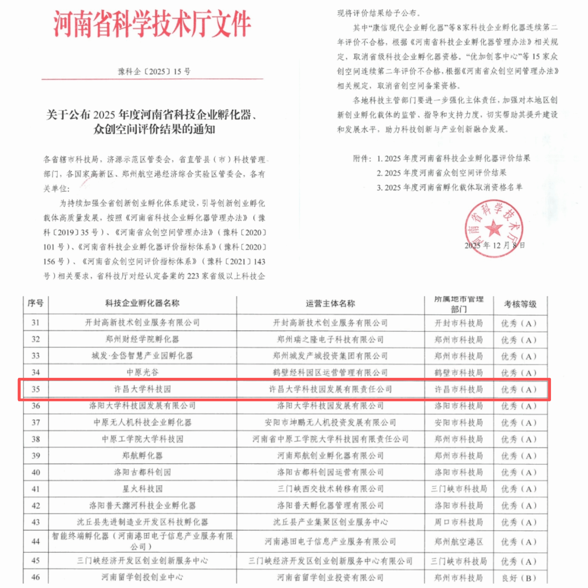 近日,河南省科技厅发布《关于公布2025年度河南省科技企业孵化器、众创空间评价结果的通知》,许昌大学科技园在全省223家省级以上科技企业孵化器评价中表现卓越,获评优秀(A)等级。自2024年以来,我校大学科技园已连续两次荣获省级优秀称号,也是全省唯一一家连续获优省属本科高校科技园。