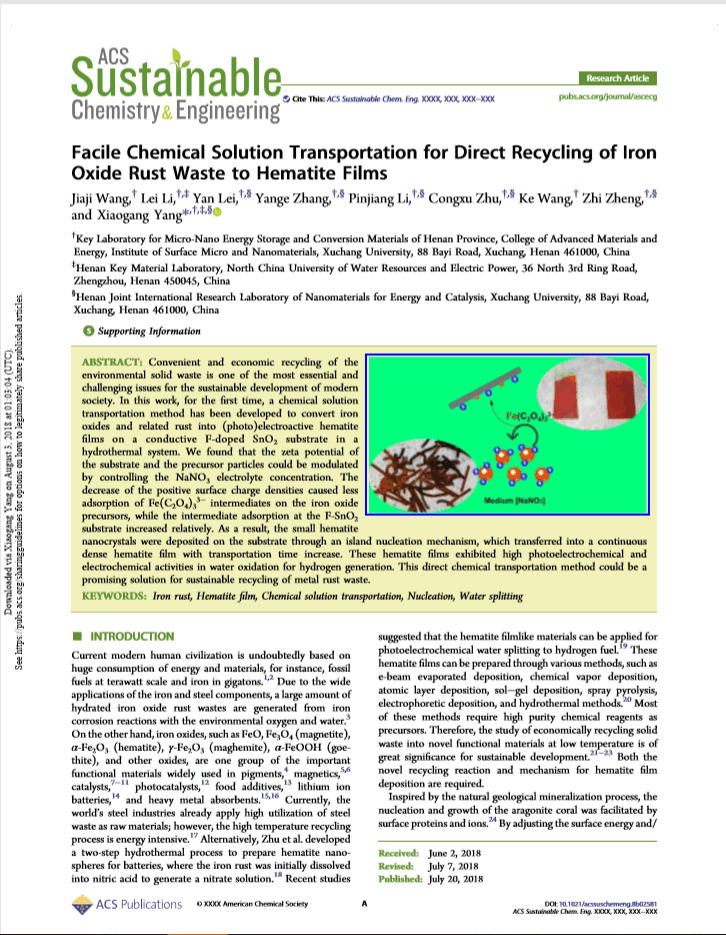近期,新材料与能源学院本科生王家稷等在杨晓刚老师指导下进行创新实验,针对如何能够循环利用铁锈废弃物这一关键问题开展研究工作。他们利用草酸作为传输剂、以硝酸钠作为表面电荷调控剂,将废弃的铁锈通过水热法传输到FTO导电薄膜上,“变废为宝”制备得到具有(光)电活性的氧化铁薄膜。这是国际上首次利用化学溶液转移方法将铁锈直接做成功能性电极薄膜。制备出的薄膜产品可应用于光电或电催化制氢的阳极材料,并低温方法解决环保铁锈固体废弃物污染。该方法模拟了自然界里的矿物传输生长过程,其中以硝酸钠改变了沉积界面的zeta电位,进一步调控表面的电荷吸附,最终实现了在导电衬底上的岛状-层状薄膜生长机制。该工作以“A Facile Chemical Solution Transportation for Direct Recycling Iron Oxides Rust Waste to Hematite Films”为题在线发表在美国化学会期刊《美国化学会可持续化学与工程》(ACS Sustainable Chem. Eng.)(2018, 6 (9),12232–12240) ,影响因子6.1。