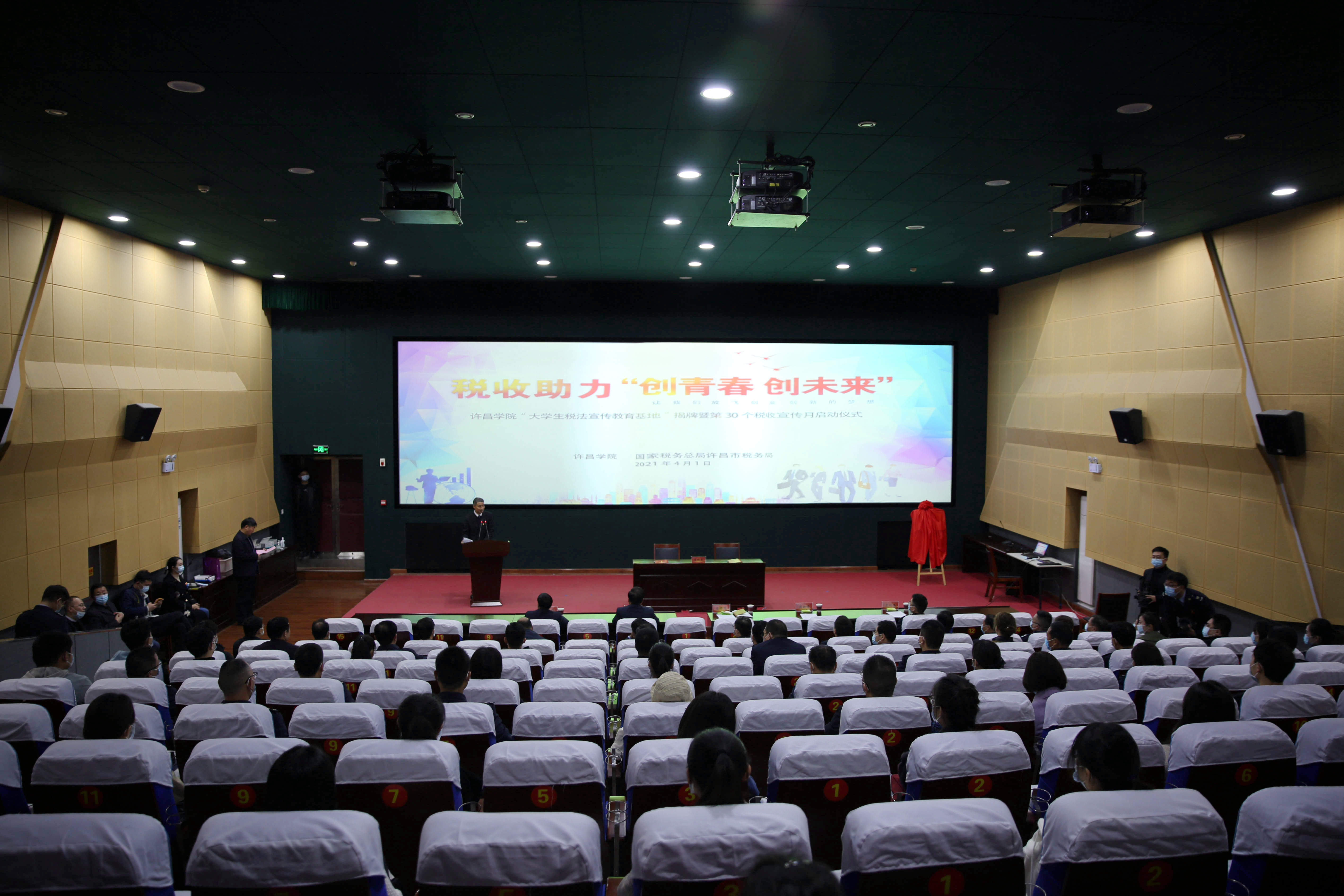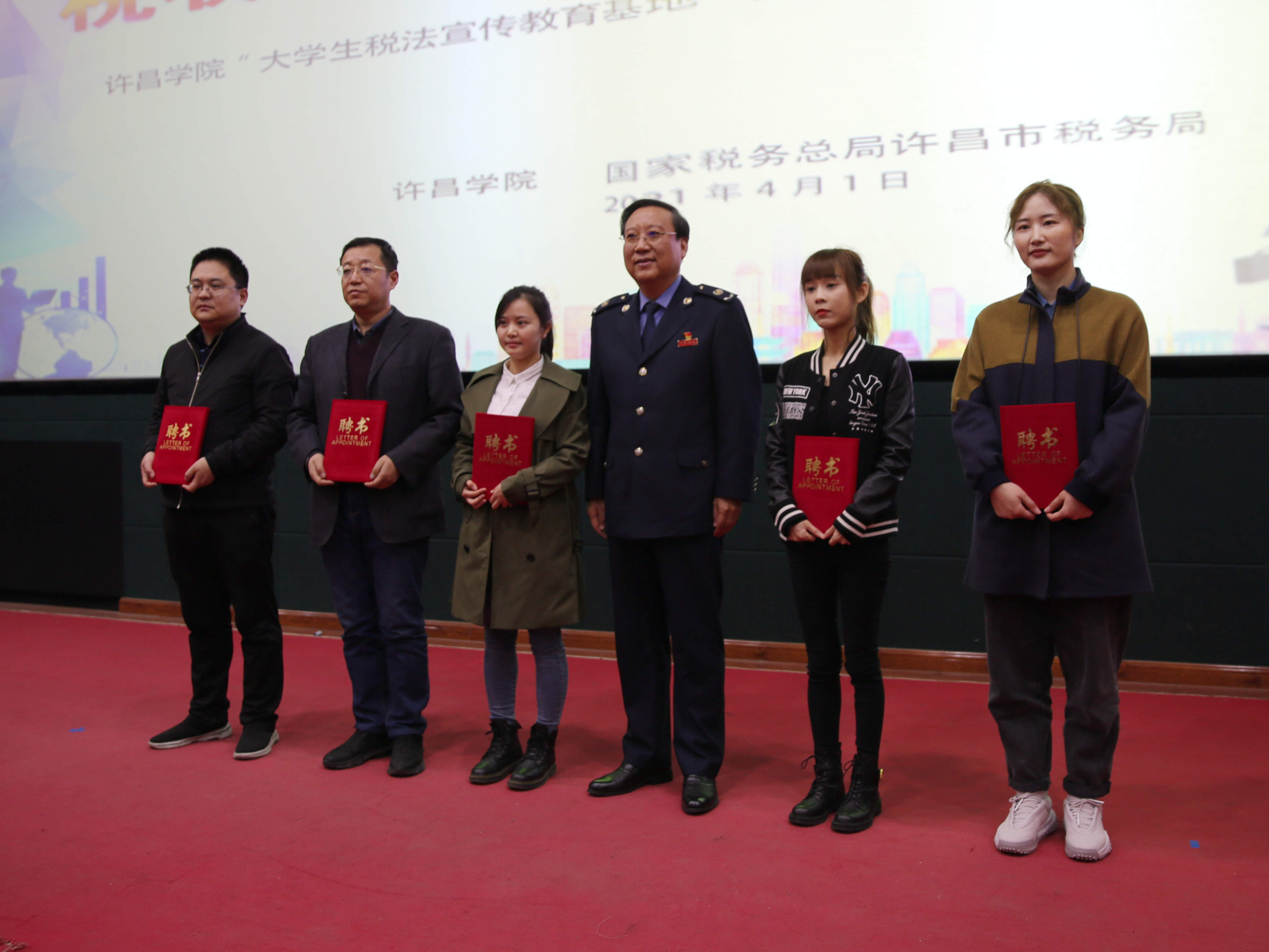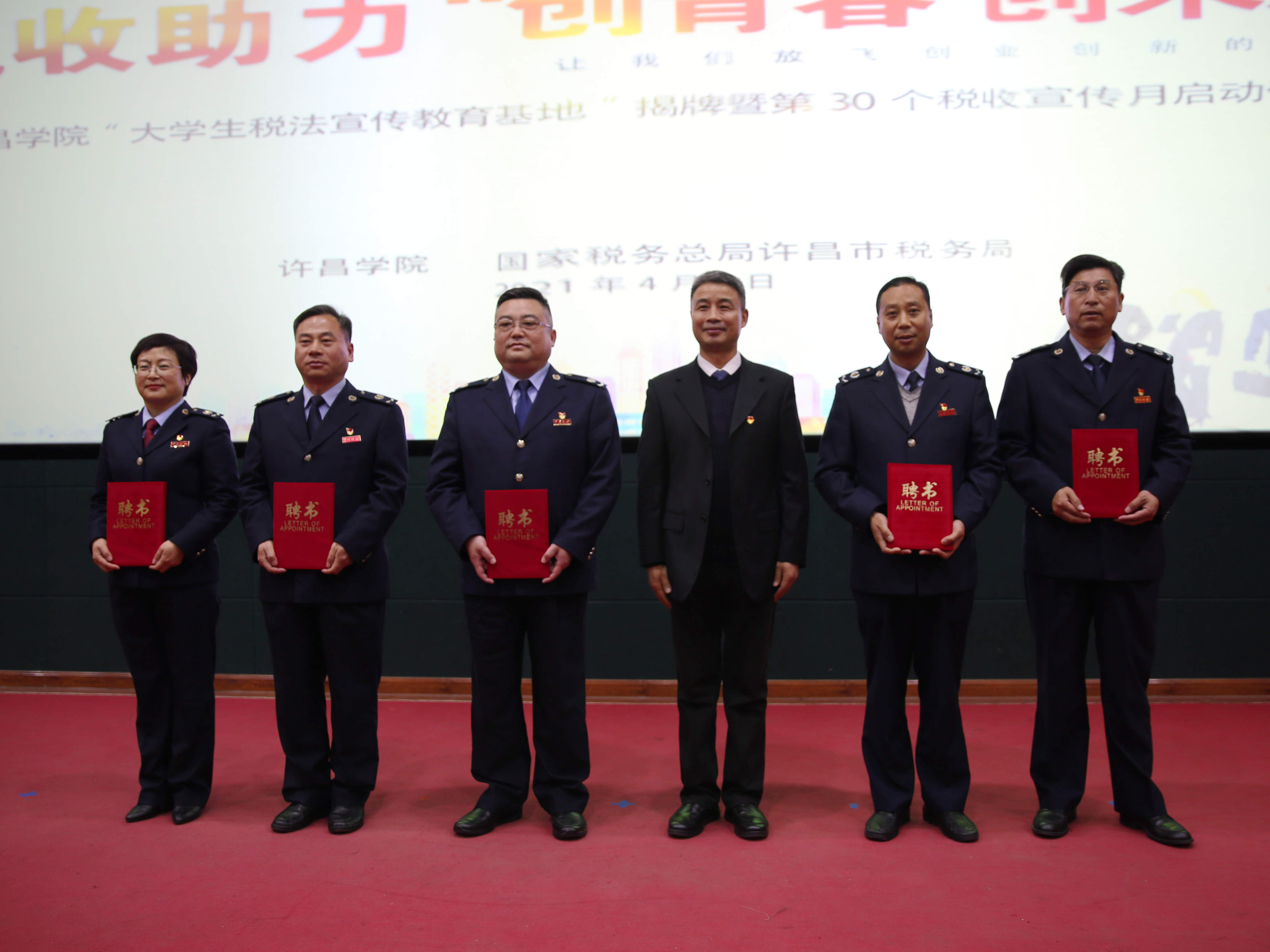 仪式上,许昌学院院长岳修峰、许昌市税务局局长宋彬共同为“大学生税法宣传教育基地”揭牌。