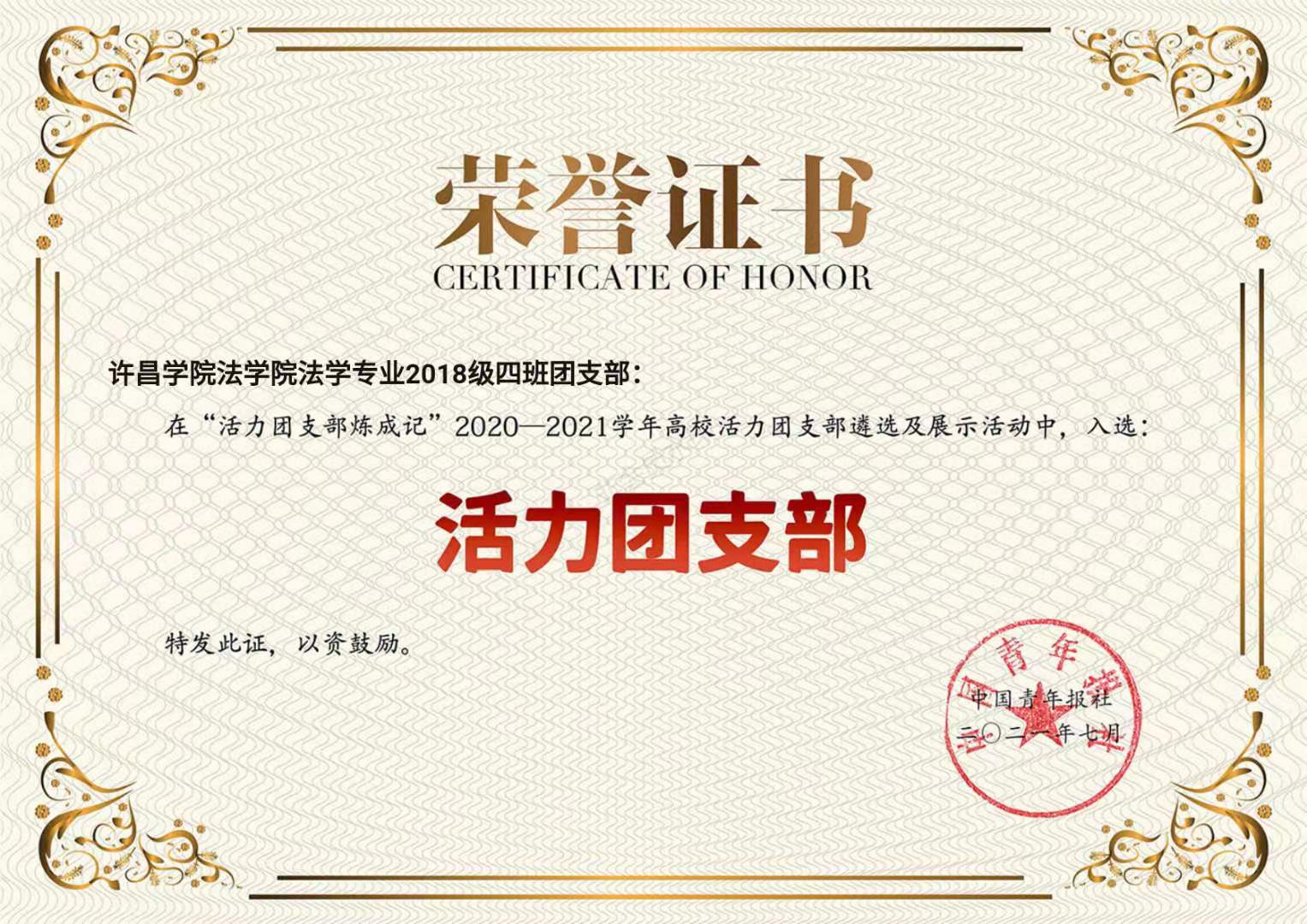 近日,由团中央基层建设部指导、中国青年报社组织开展的“活力团支部炼成记”2020-2021学年全国高校“活力团支部”创建遴选活动结果揭晓。经校级申报、省级初评、网络展示、全国终审等环节,我校法学院法学专业2018级四班团支部荣获2020-2021学年全国高校“活力团支部”荣誉称号。