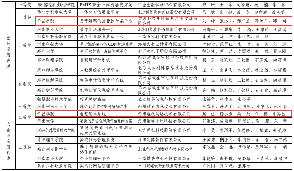 我校信息工程学院(鲲鹏产业学院)师生首次参赛,与黄河科技集团信息产业发展有限公司、河南煜祺网络技术有限公司、河南宸宇扬电子科技有限公司组建三支校企联合团队,团队提交的《基于鲲鹏的指静脉采集平台》《智慧配料系统》和《物联网工程实践创新教学平台的设计与实现》作品,经过行业初审、专家评审和线上答辩,在近百个团队中脱颖而出,分获“金融应用赛道”“大企业应用赛道”和“开放赛道”二等奖。(图片由信息工程学院提供)