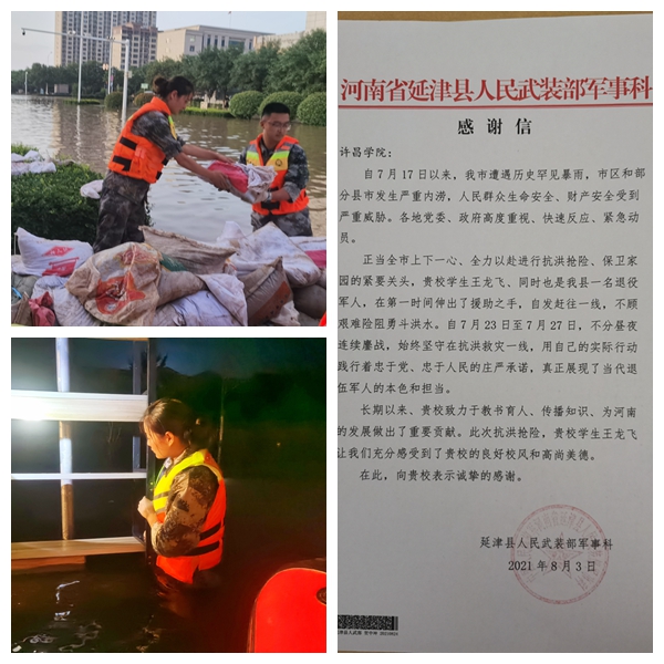 化工与材料学院学生王龙飞,是一名来自新乡市延津县的退役军人。在全市上下一心、全力以赴进行抗洪抢险、保卫家园的紧要关头,王龙飞迅速响应号召,第一时间与30多位退役军人一起自发组建“延津县退役军人抗洪突击救援队”,赴新乡、卫辉进行抗洪抢险救灾,用自己的实际行动践行忠于党、忠于人民的庄严承诺,真正展现了当代退伍军人的本色和担当。