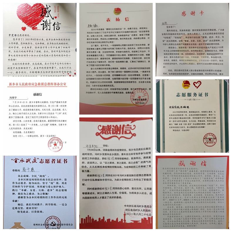 河南汛情牵挂亿万人的心,国家疫情带动众多人的情。从一摞摞的表扬信中我们可以看到,城市与环境学院的程子景、刘华梁,电气与机械工程学院的李辰龙、闫文鑫,美术与设计学院的赵子瑶、王隽迪,信息工程学院的韩世浩、李嘉诚,文史与传媒学院的耿晓颖、侯佳铭,土木工程学院的郭晓莉、王淼,体育学院的陈柯冰、窦翔宇,商学院的冯浩等我校各学院数百位学生,他们在汛情疫情来临的关键时刻,踊跃投身志愿服务一线,无畏艰辛、真诚奉献,成为家乡防汛抗疫工作中的“得力助手”。