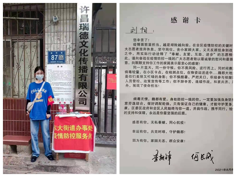 2021级的新生亦是如此。法学院2021级法学专业一班学生刘阳,出于作为许昌本地市民的义务与责任感,响应社区号召,主动报名成为一名志愿者,积极参与所在社区防疫管控登记、政策宣传学习等工作。8月8日,当收到许昌市魏都区人民政府送来的感谢信时,她说:“疫情面前显担当,越是艰险,青年人越是更应该向前!”