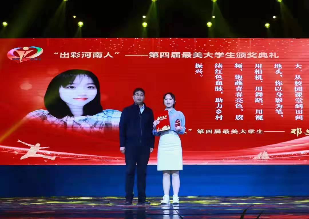 本次颁奖典礼以“青春的颜色”为主题为大家上了一堂生动的思政课,讲述了11位最美大学生的青春故事,展现了新时代大学生的青春担当与梦想。我校邓安琪同学利用自己所学的专业知识,带领团队成员助力乡村振兴和红色产业,推广红色文化旅游,为因疫情滞销的农产品拍摄宣传视频,视频点击量突破150万,帮助滞销农产品拓宽销路,事迹被河南日报等媒体连续报道。