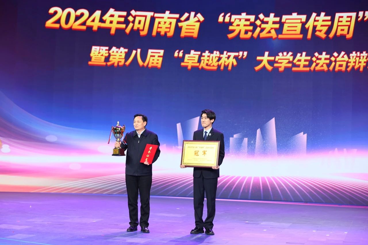 12月2日,2024年河南省“宪法宣传周”启动仪式暨第八届“卓越杯”大学生法治辩论赛决赛在河南电视台演播大厅举行。我校法学院代表队凭借扎实的法律知识基础、高超的辩论技巧和出色的表现,在21支参赛队伍中脱颖而出,成功摘得桂冠。校纪委书记申占伟出席活动并领奖。