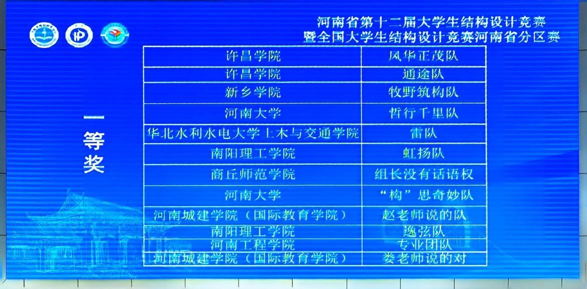 5月16日至18日,由河南省教育厅主办、河南理工大学承办的“中交路建杯”河南省第十二届大学生结构设计竞赛暨全国大学生结构设计竞赛河南省分区赛在焦作市河南理工大学隆重举行。我校土木工程学院两支参赛队伍分别以总分第一名和第二名的成绩获2项一等奖,学校获优秀组织奖。