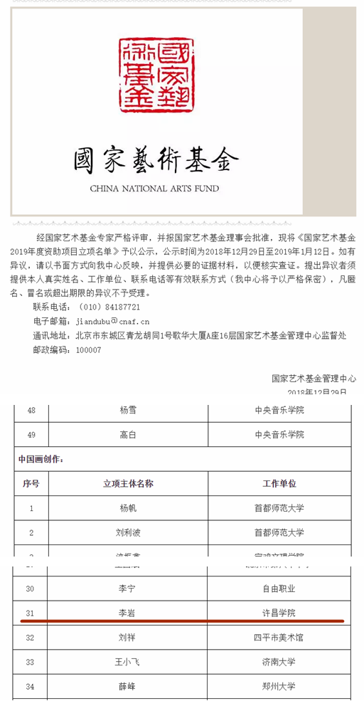 近日,国家艺术基金管理中心对2019年度国家艺术基金立项名单进行公示,我校美术学院青年教师李岩获2019年度“国家艺术基金青年艺术创作人才资助项目”立项。2019年度国家艺术基金项目河南省共有38项入围,其中“中国画创作”资助项目立项共4项,我校美术学院教师为首次获国家艺术基金立项资助。