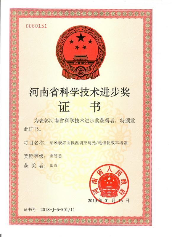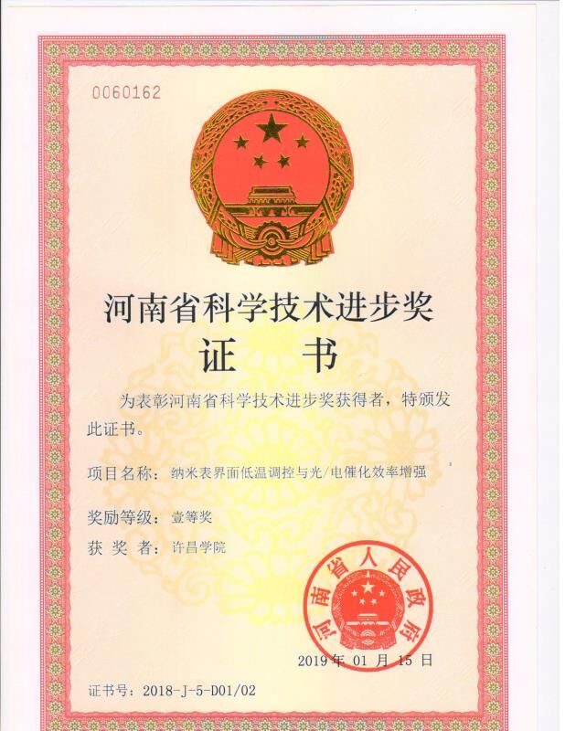 近日,河南省人民政府公布了《关于2018年度河南省科学技术奖励的决定》(豫政[2019]3号),我校郑直教授领衔完成的项目《纳米表界面低温调控与光电催化效率增强》,获得了河南省科技进步奖一等奖,实现了我校在河南省最高级别科技奖励的重大突破。