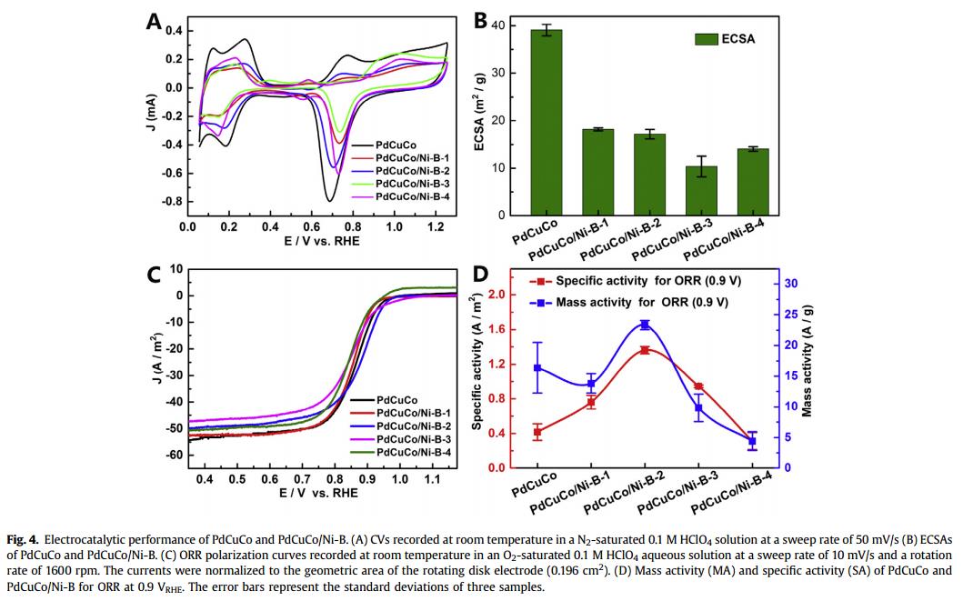 李婷婷博士通过合金化策略,成功合成得到了三维枝状PdCuCo合金催化剂,过渡态金属Cu与Co的引入使Pd基催化剂产生压缩应变,能够有效提升其催化活性。为避免Pd基催化剂在催化过程中的聚集失活,本文引入无定形硼化镍膜对催化剂进行包覆,包覆膜可以作为电子受体用于调节催化剂的表面电子结构,保证催化剂结构稳定性的同时进一步提升催化活性,和催化剂的复合相互作用效应呈现出质量活性(MA)正态分布趋势。相比于商业钯碳,本文合成的复合催化剂ORR和MOR活性分别是PdCuCo的3.3和4.1倍。本文所提出的新颖Pd基催化剂设计方法,能够有效的促进其他催化剂的合成与应用。