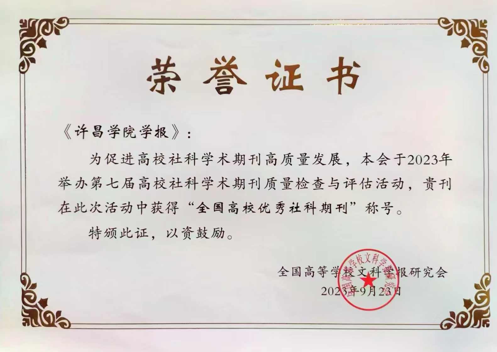 全国高等学校文科学报研究会是国家一级学会,定期组织全国高校社科学术期刊评优活动,旨在促进高校社科学术期刊高质量发展。此次获奖是对《许昌学院学报》办刊质量和学术影响力的认可。(图片由学报编辑部提供)