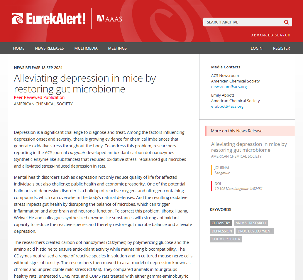 9月18日由美国科学促进会(AAAS)主办的全球科技新闻服务网站EurekAlert!以“Alleviating depression in mice by restoring gut microbiome”为题,报道了我校化工与材料学院(表面微纳米材料研究所)在纳米酶治疗抑郁症方面的研究成果,该成果以“Antioxidant Carbon Dots Nanozymes Alleviate Stress-induced Depression by Modulating Gut Microbiota”为题发表在美国化学会旗下期刊Langmuir (DOI:10.1021/acs.langmuir.4c02481)。随后,美国化学会,美国物理学家组织网Phys.org, AZoNano, Applied Microbiology International等多家科技新闻网站纷纷报道,该研究得到了广泛国际关注。