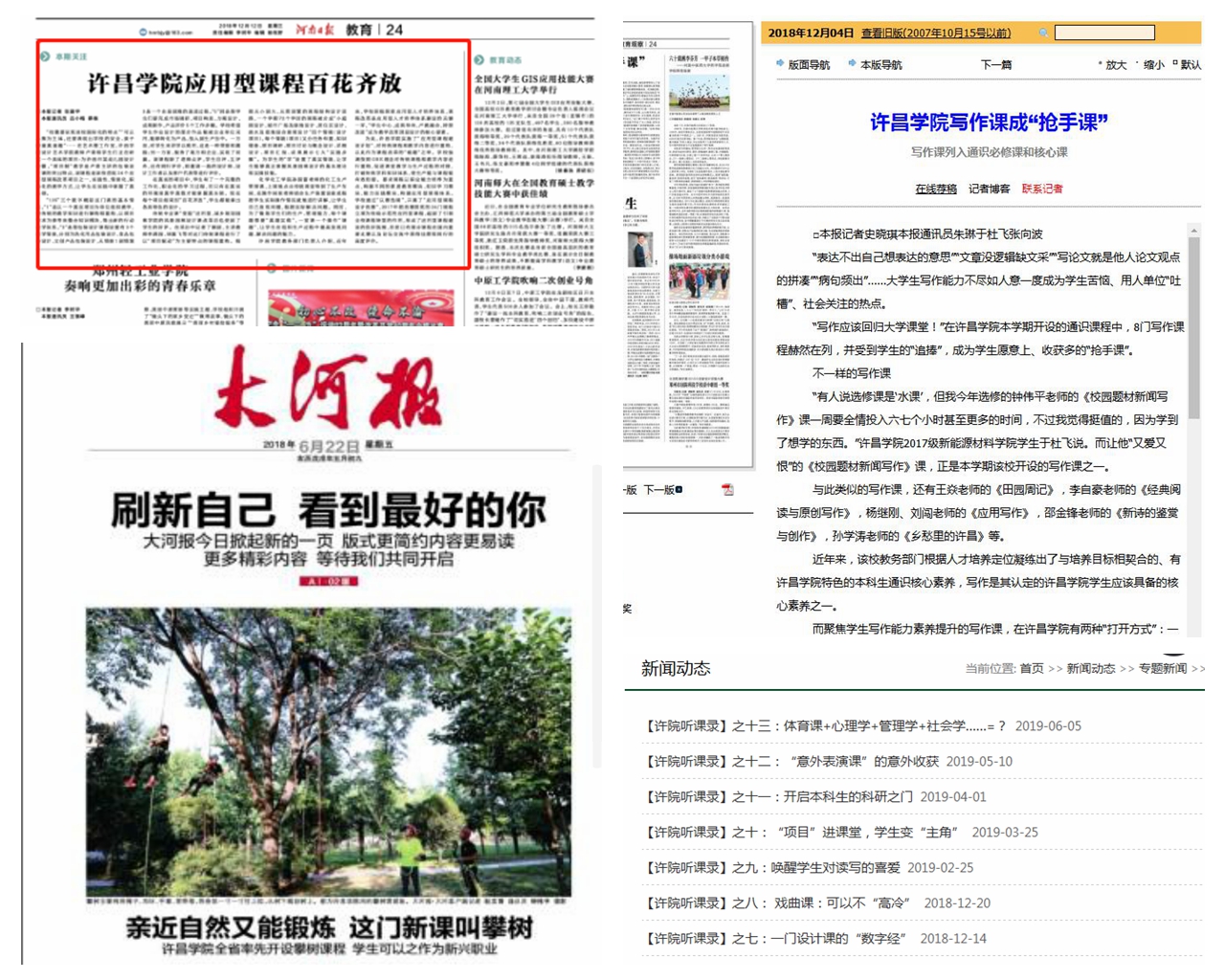 《许昌学院应用型课程百花齐放》《许昌学院写作课成“抢手课”》 《攀树你会吗?许昌这所高校开设攀树课程》……,2018年以来,《河南日报》《大河报》等媒体多次对我校课程改革进行报道,向外界展示了我校近年来课程改革的成效。