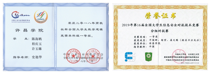 应用数学学科建设发展有力的推动促进了数学与应用数学专业建设和人才培养质量的提升。近年来,学生在全国大学生数学建模竞赛、美国大学生数学建模竞赛、全国大学生信息安全与对抗技术竞赛等国内外重要学科竞赛中取得优异成绩。学科点成员积极参与硕士研究生培养工作,目前已与郑州大学、华北水利水电大学、河南工业大学、郑州轻工业大学等高校开展联合硕士生培养。培养的硕士研究生基础扎实、实践创新能力强,全部考入知名高等学府继续攻读博士学位。