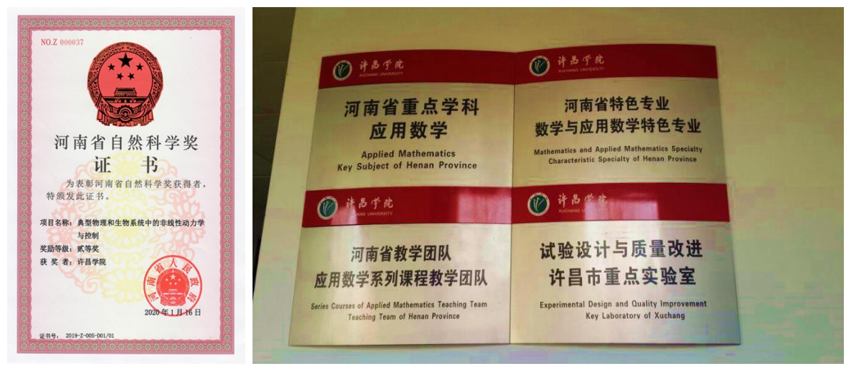 图5河南省自然科学二等奖证书(左)、应用数学学科建设部分平台(右)