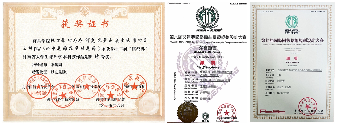 2018年以来,风景园林专业本科生先后参与了许昌学院创业大赛、河南省“挑战杯”大学生课外学术科技作品竞赛、“中原风采技能大赛”以及“全国艾景奖园林设计大赛”,获得金奖1项,一等奖5项,二等奖13项。近三年来,风景园林专业毕业生就业率为98.3%,用人单位对风景园林专业毕业生(实习生)的满意度为96.7%。